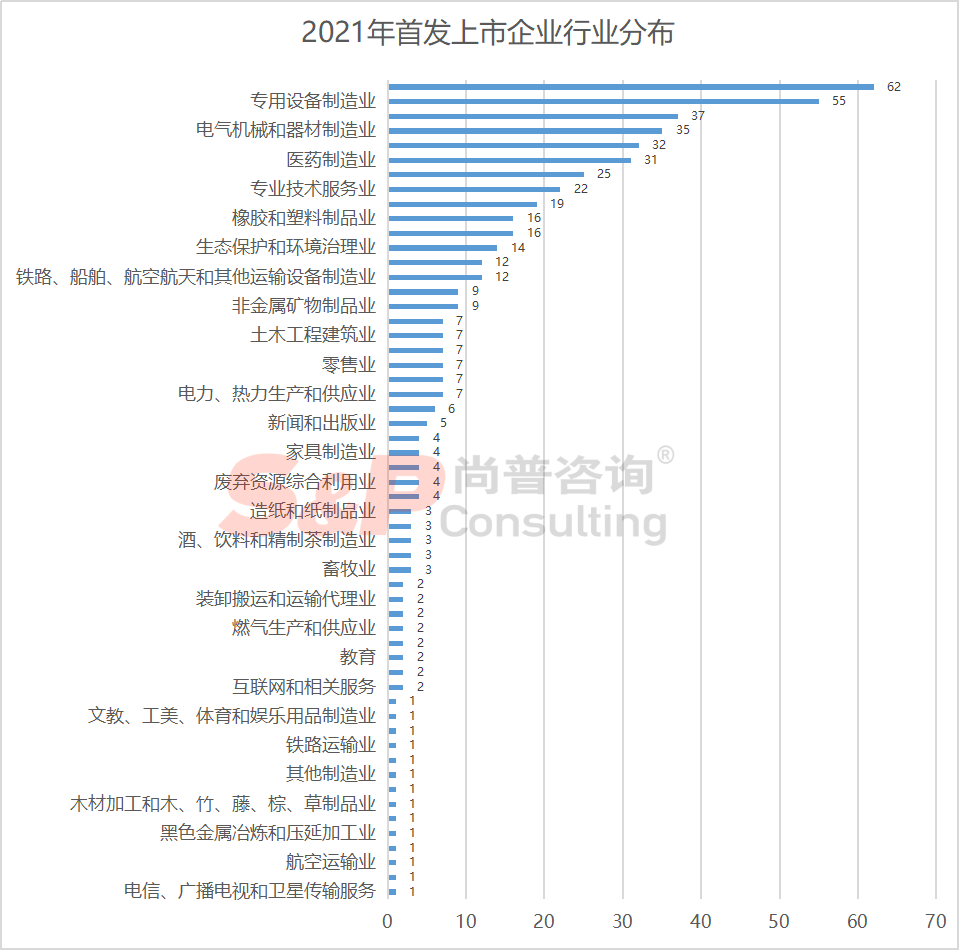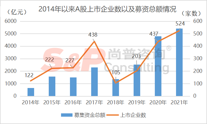 据尚普咨询统计,2021年A股首发上市企业共524家,IPO募集资金总额5426亿元,分别较2020年增长20%和13%,数量及金额均创近年来新高。